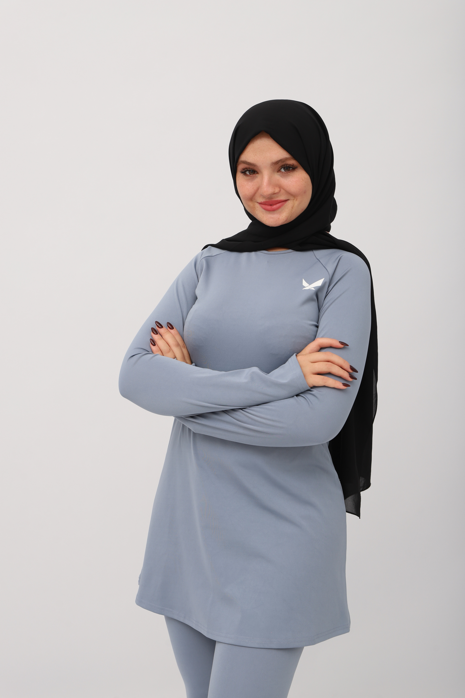 Conçu pour les femmes voilées, ce set se compose d’un haut long à manches raglan et d’un legging taille haute.
